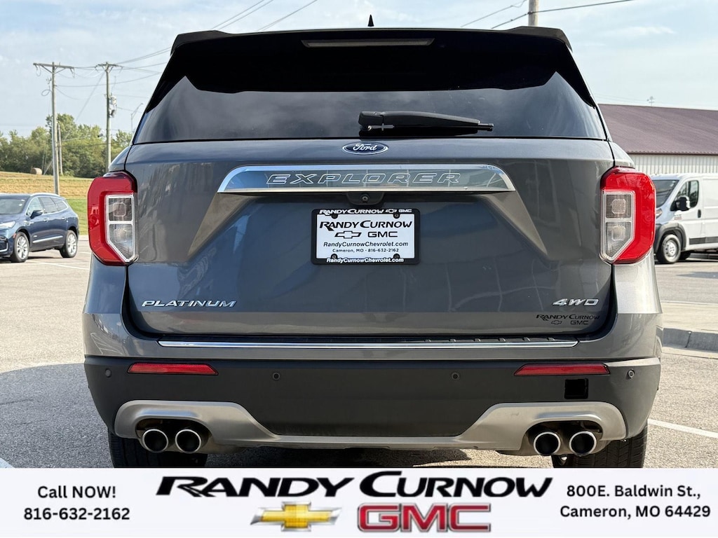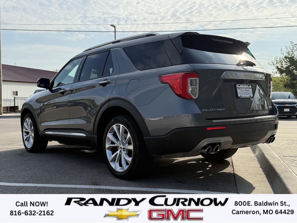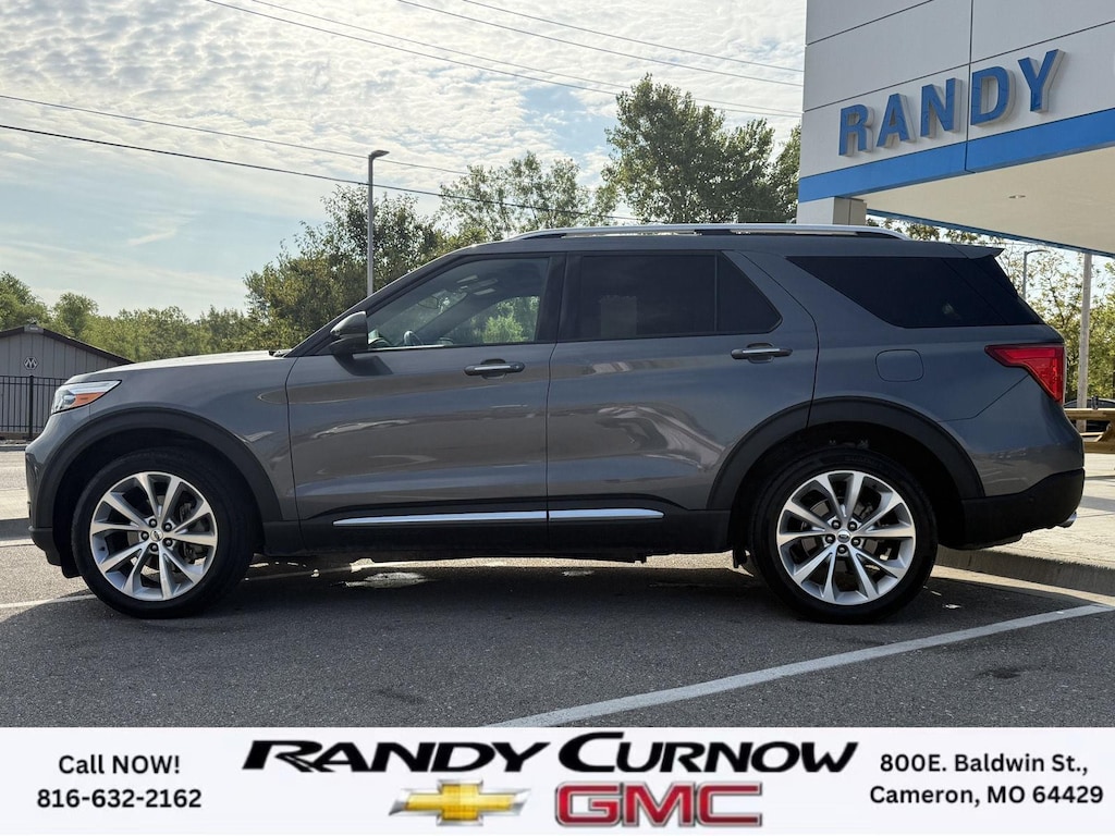This 2022 Ford Explorer Platinum, has a Carbonized Gray Metallic exterior with a Ebony interior. Call us at 816-632-2162 and reference stock Number U7943B for further details. No Accidents! One Owner! IMPORTANT PACKAGE INFORMATION: Premium Technology Package ($1,295 value)10.1" LCD Capacitive Portrait Touchscreen2 Additional SpeakersEquipment Group 601A ($1,400 value)10-Speed Automatic TransmissionEngine: 3.0L EcoBoost V6Leather Heated and Ventilated Sport Captain's Chairs3.31 Non-Limited-slip Rear Axle Ratio6,160 lbs GVWRB&O Sound System by Bang and OlufsenP275/45R21 AS BSW Tires21" Bright Machined-Face Aluminum Wheels Safety and Security The vehicle is equipped with a system that senses, and then prepares, the vehicle and/or occupants, for an impending forward collision. The vehicle constantly monitors the roadway in front of the vehicle and identifies and tracks pedestrians on an interior display. If the system determines a likely impact, it will automatically take preventative steps to avoid hitting the pedestrian. With this system the driver's hands must remain on the wheel at all times but can be removed briefly (for a few seconds), otherwise the vehicle will prompt the driver to put their hands back on the wheel.Technology and Telematics Without the need for a manufacturer specific app to be installed on the smart device, the vehicle infotainment system can access and control functions of a smart device physically plugged-into the vehicle. Mobile devices can wirelessly connect to the internet through the vehicle's private mobile network. OTHER NOTABLE FEATURES AND OPTIONS YOU SHOULD KNOW ABOUT: ENGINE: 3.0L ECOBOOST V6 Engine Auto Stop-Start Feature, Regenerative 4-Wheel Disc Brakes w/4-Wheel ABS, Front And Rear Vented Discs, Brake Assist, Hill Descent Control, Hill Hold Control and Electric Parking Brake, Deep Tinted Glass, 2 LCD Monitors In The Front, Heated Leather Steering Wheel, 3 12V DC Power Outlets, Adaptive Cruise Control with Stop-and-Go, HVAC -inc: Underseat Ducts and Headliner/Pillar Ducts, Voice-Activated Touchscreen Navigation System -inc: pinch-to-zoom capability, SiriusXM Traffic and Travel Link, Note: SiriusXM Traffic and Travel Link includes a 5-year prepaid subscription, SiriusXM Traffic and Travel Link service is not available in Alaska or Hawaii, After your trial period ends, Sirius XM audio and data services each require a subscription sold separately, or as a package, by SiriusXM Radio Inc, See SiriusXM customer agreement for complete terms at www.siriusxm.com, All fees and programming subject to change, Trial subscriptions not available in Alaska and Hawaii, 3 12V DC Power Outlets and 1 Interior 120V AC Power Outlet, Mykey System -inc: Top Speed Limiter, Audio Volume Limiter, Early Low Fuel Warning, Programmable Sound Chimes and Beltminder w/Audio Mute, Back-Up Camera w/Washer, Front Camera w/Washer, Left Side Camera, Right Side Camera SERVING OUR FRIENDS AND NEIGHBORS IN CAMERON AND THE SURROUNDING AREA! At Randy Curnow Chevrolet GMC, we strive everyday to provide a car-buying and -servicing experience that's truly unparalleled. We offer incredibly low prices on our Chevrolet, GMC models for sale, while also giving back to the community that supports us. Plus, we're the home of the free lifetime warranty! Hurry down to our Chevy dealership in Cameron, MO, now to see what we have in store for you. No matter if you're shopping for a new Chevy truck, GMC SUV or Buick luxury car, you'll find what you're looking for on our lot. Our nearby MO GMC dealership offers truly massive new, used and Certified Pre-Owned car inventories for you to browse. What's more, if you want to save on the new Buick SUV or Chevrolet model that you have your eye on, make sure to check out our new GMC lease specials and finance offers. We're always updating our Buick lease and Chevy financing incentives to include all your favorite vehicles, so stop by Randy Curnow Chevrolet GMC today! FINANCING OPTIONS: Take advantage of ou